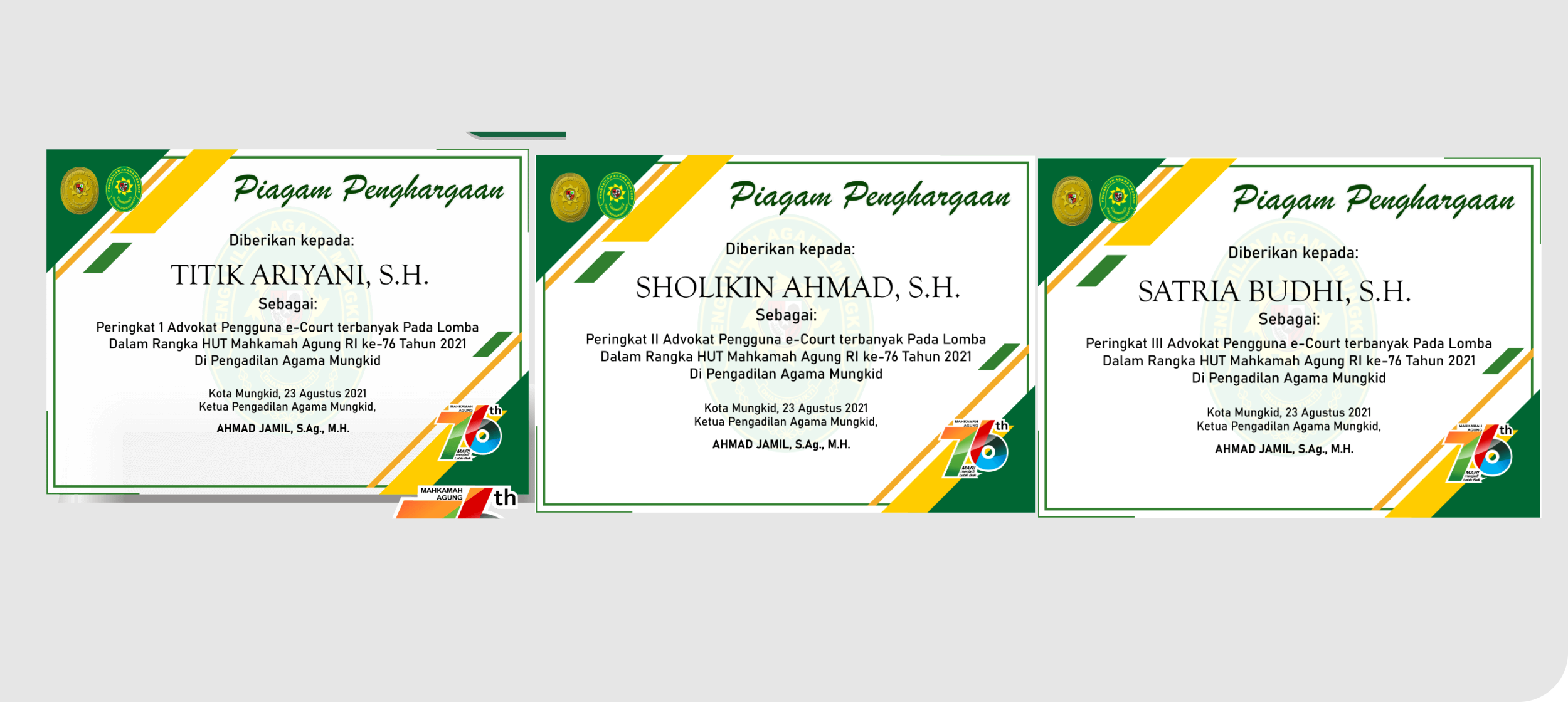 Selamat Kepada Juara I, II dan III Advokat Pengguna Layanan E-Court yang terdaftar di Pengadilan Agama Mungkid. Sebagai Wujud Mensukseskan Peradilan Elektronik (E-Court) khususnya di Pengadilan Agama Mungkid. Kami berikan kepada 3 Advokat Pengguna terbanyak dari 10 daftar pengguna dihitung dari Bulan Januari-Juli Tahun 2021 :